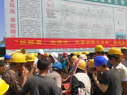 同時(shí)為進(jìn)一步推進(jìn)保障房項(xiàng)目文明施工管理,7月26日上午,公司黨委、工會(huì)、安委會(huì)再次對(duì)丈八路保障房項(xiàng)目開展“送清涼·享關(guān)愛”防暑降溫慰問活動(dòng)。將西瓜、綠豆、白糖等防暑降溫用品送達(dá)施工一線的工人手中,并叮囑大家一定要嚴(yán)格執(zhí)行高溫措施,注意勞逸結(jié)合和防暑降溫,切勿麻痹大意造成傷害。長(zhǎng)期身處一線職工對(duì)公司黨委、工會(huì)和安委會(huì)的關(guān)愛行動(dòng)表示感謝。