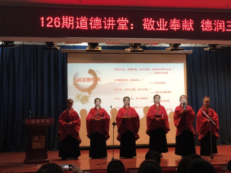 此次講堂共有五個(gè)環(huán)節(jié),圍繞“敬業(yè)奉獻(xiàn),德潤(rùn)三秦”,這一主題,以唱《公民道德歌》、講道德故事、誦道德經(jīng)典、念勸善詞、做道德承諾等形式開展。每個(gè)環(huán)節(jié)的內(nèi)容都豐富多彩,引人深省,讓大家受益匪淺。